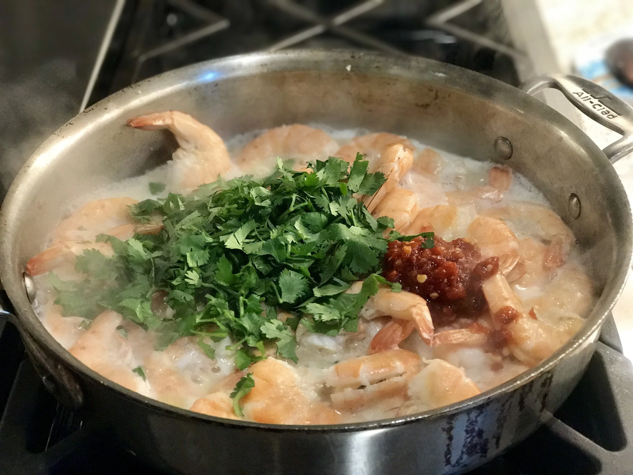 As soon as the shrimp looks done, add the sambal oelek, lime juice and cilantro. Give it a good stir, season with salt and pepper and remove from the heat.