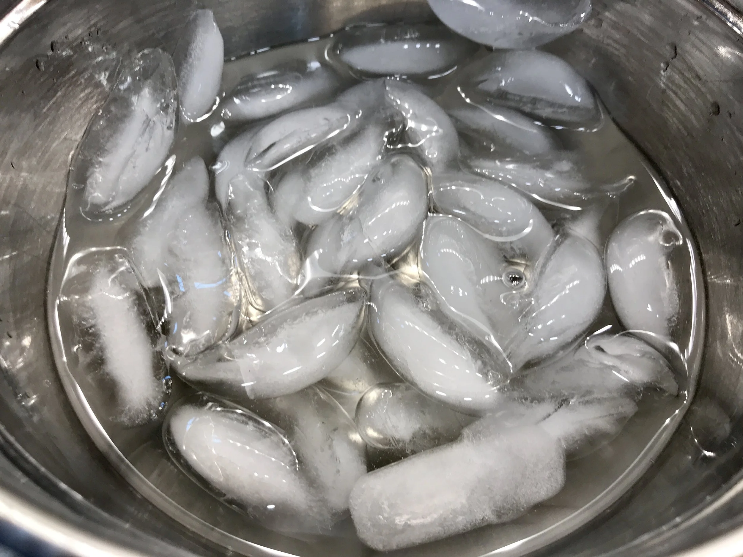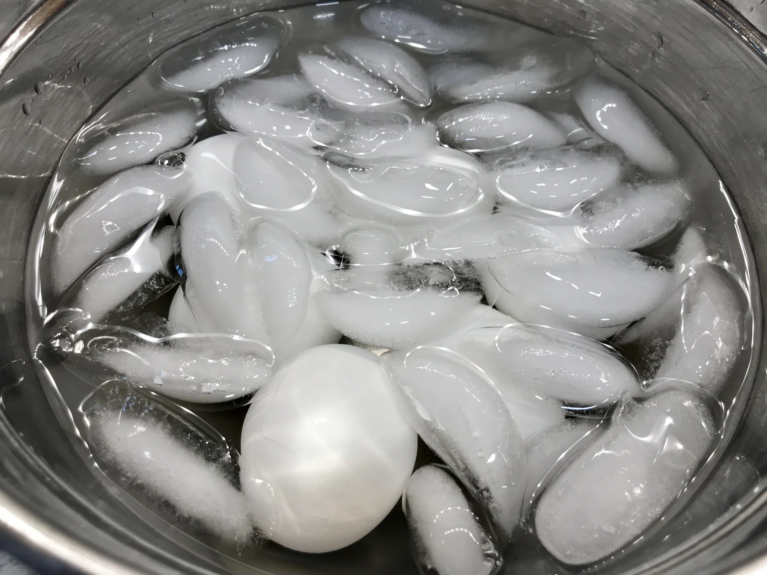 When the timer is up, pull the eggs out of the steamer basket and immediately submerge them into the ice water bath.