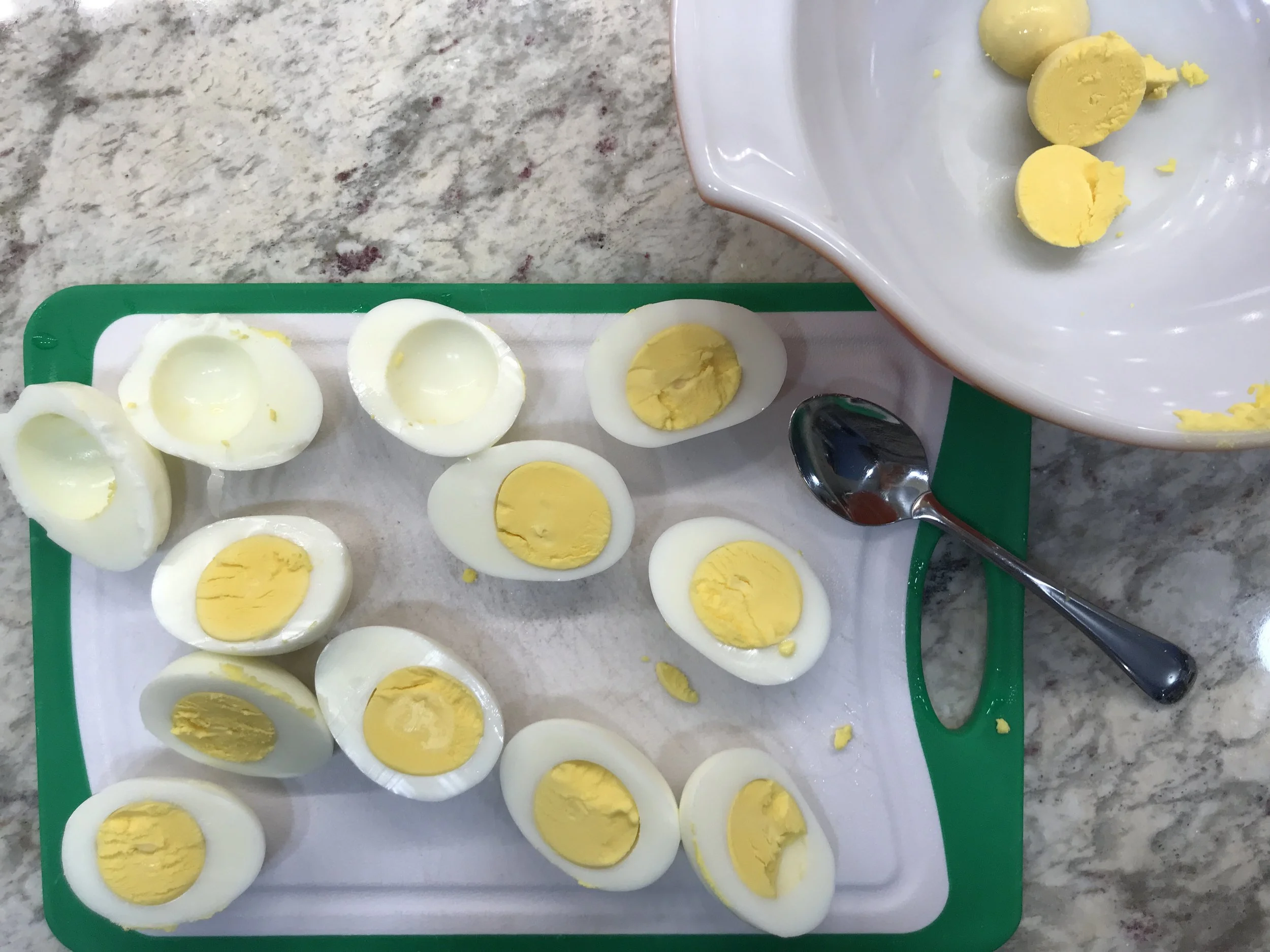 PREPARATION TIP: If you are heading to a party and in charge of deviled eggs, putting the filling in a piping bag will ensure your deviled eggs stay pretty. Store the filling in the piping bag until you get to the party and then take a minute fill each egg. If you use disposable piping bags, even better!