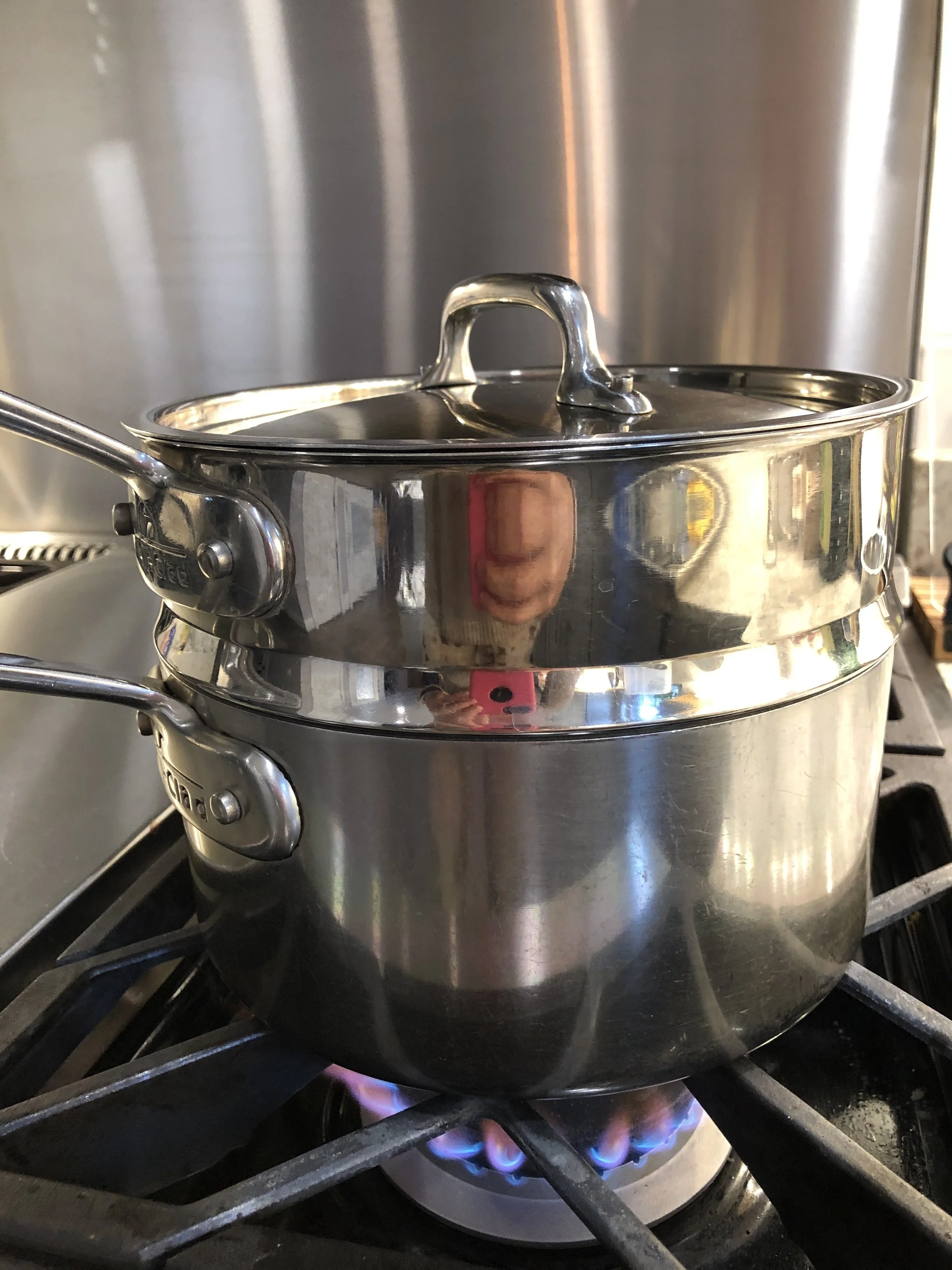 1st, set a pot with a few inches of water and turn it on high. When the water starts to steam, lay the steam tray filled with eggs over the pot and cover with a lid. Set the timer for 13 minutes if you have not crowded the eggs and 14 minutes if you stuffed the steamer.